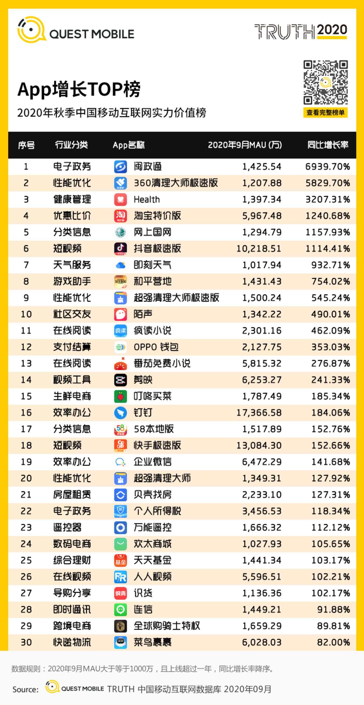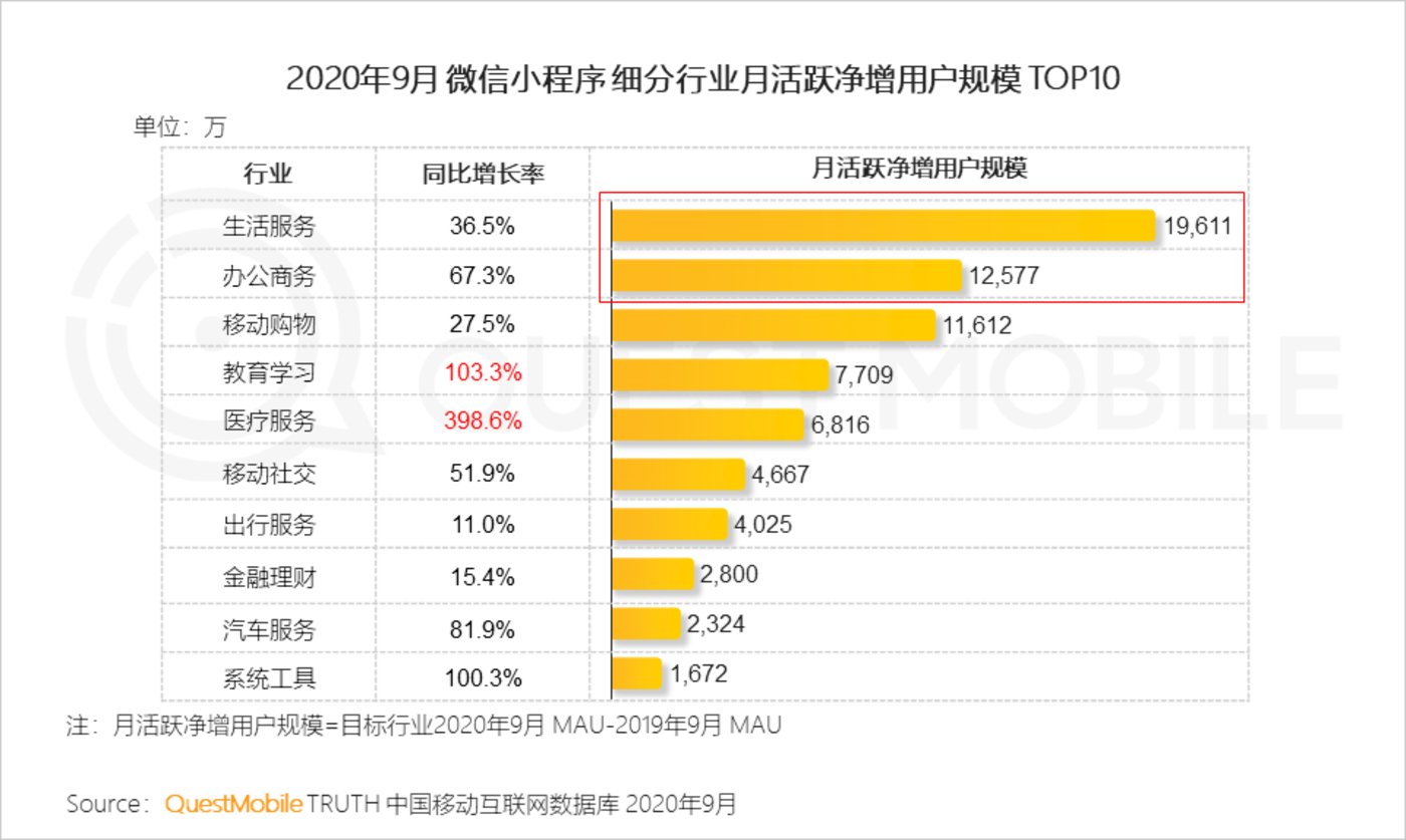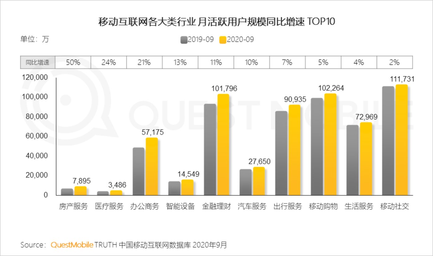 房产、医疗、办公等行业活跃用户规模增速显著,线上应用服务成为线下生活重要的流量来源和补充