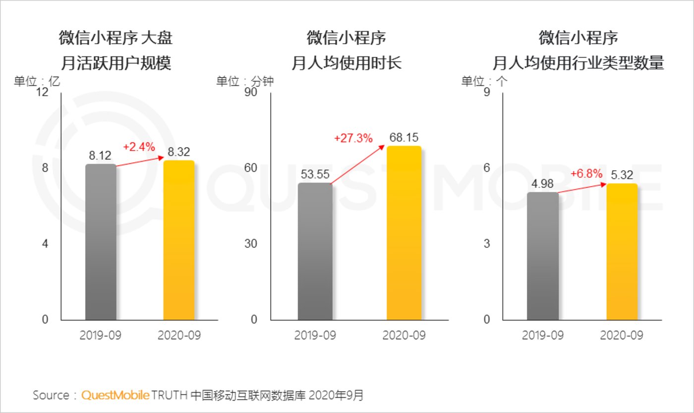 微信小程序用户习惯正逐渐成熟,基于线上场景的延续,和实体场景的补充,月人均使用微信小程序的时长增长明显,已超过1小时