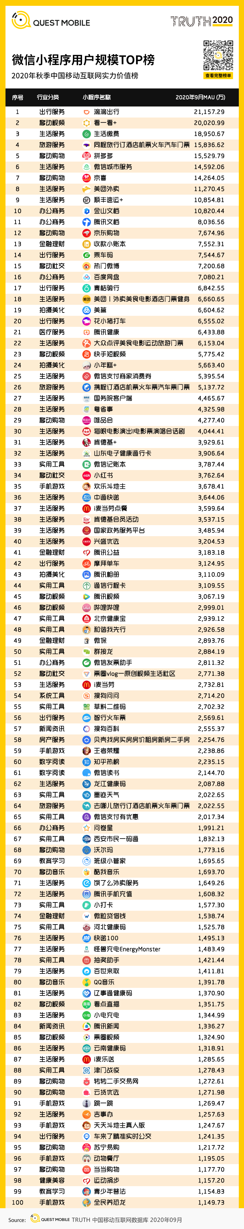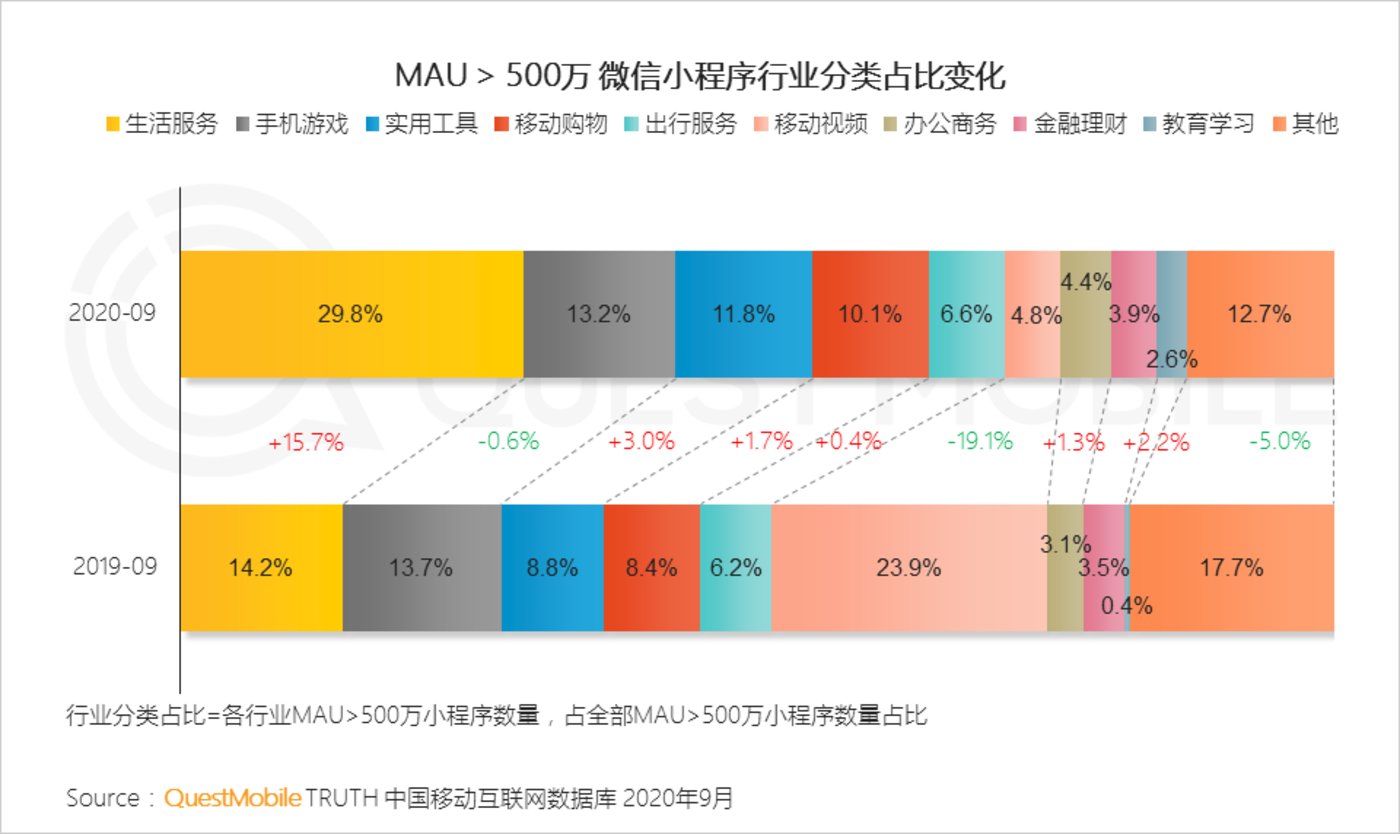 随着疫情常态化, “健康码” 小程序普遍应用,生活、工具等服务小程序增长突出;用户规模在500万以上小程序,向头部行业集中的趋势明显