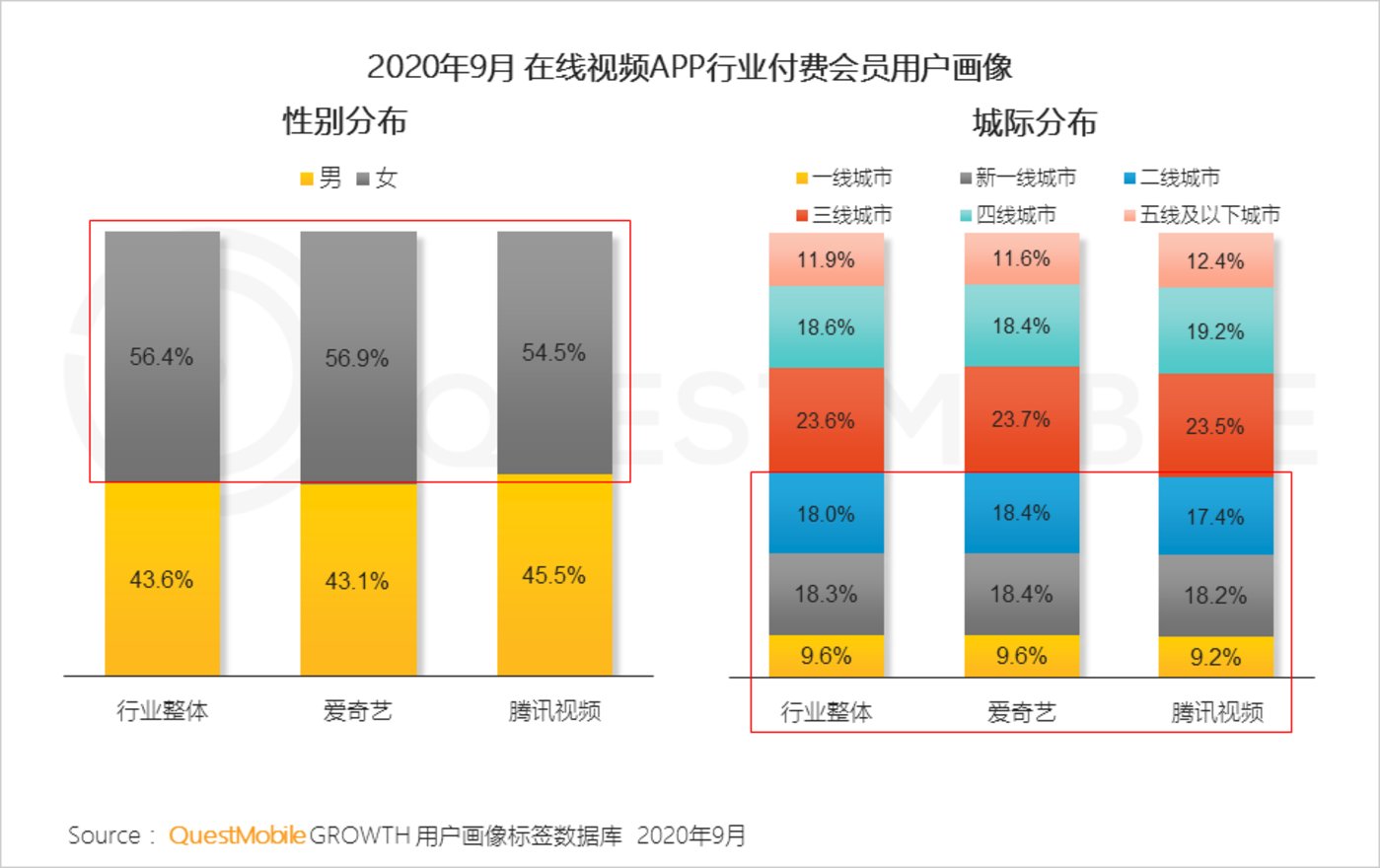 3.3 在线视频付费会员多为女性用户,高线城市占比近五成,下沉市场仍有拓展空间