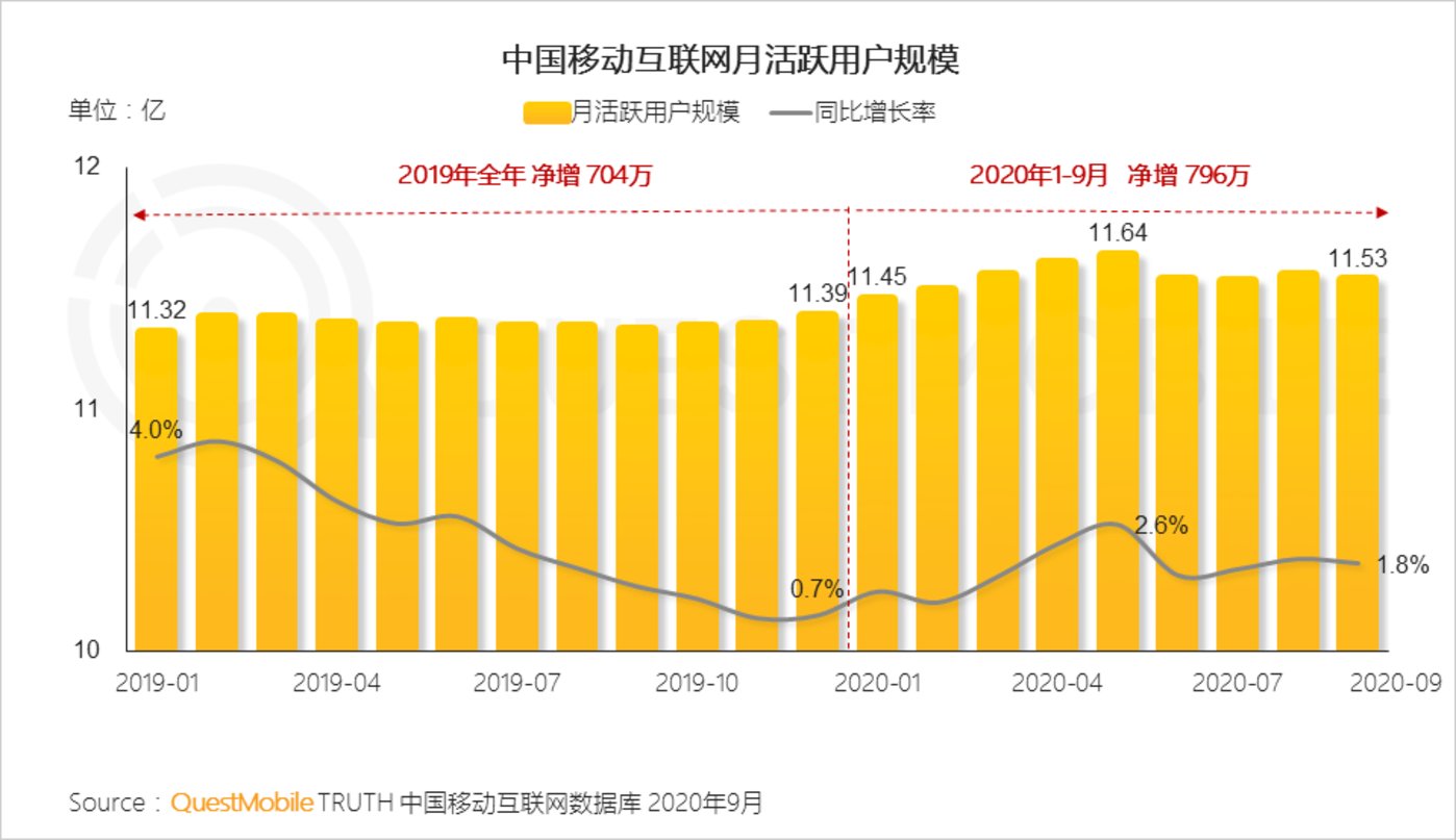 I.随着国内疫情防控常态化,中国移动互联网用户规模Q3趋于稳定,2020年1-9月净增用户规模已超过去年全年增长