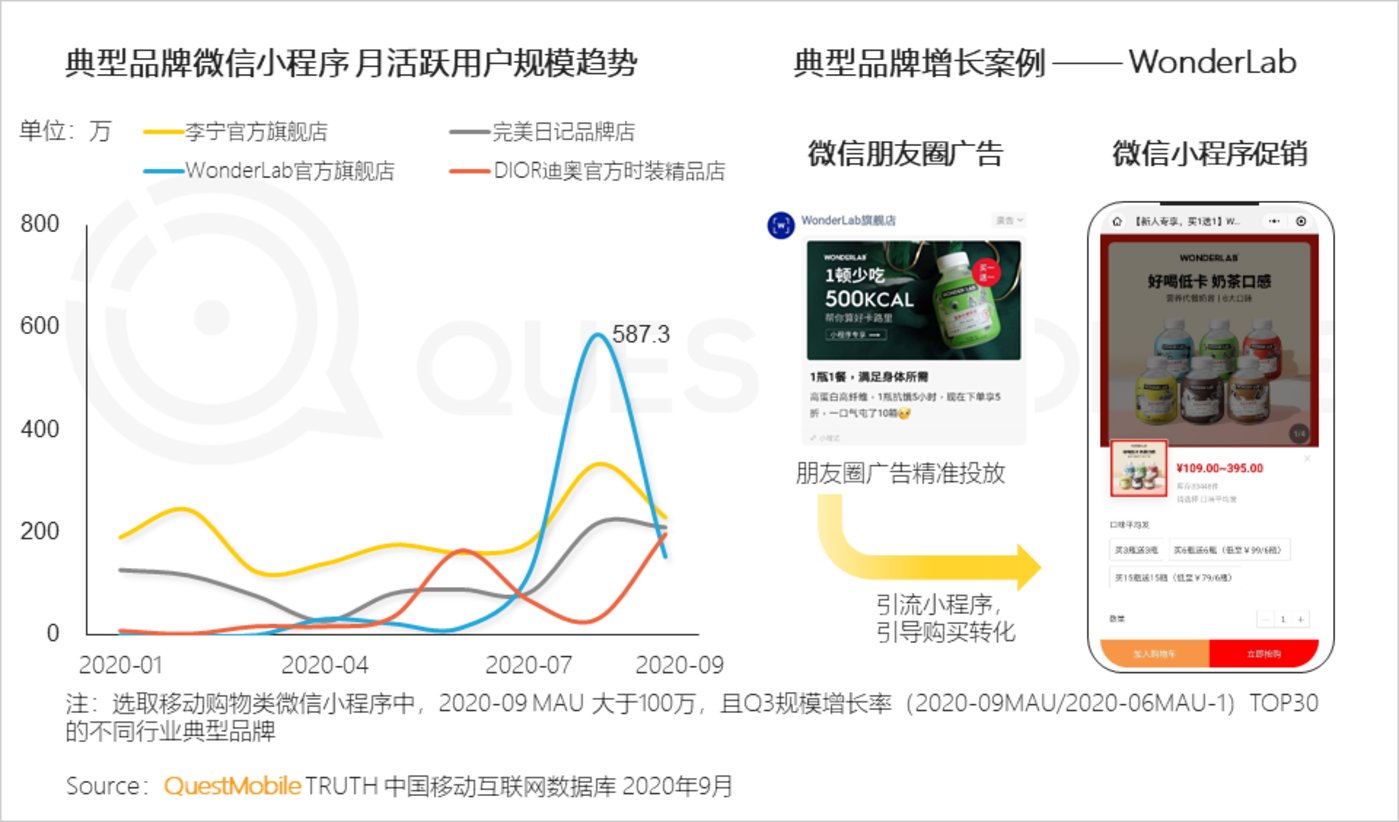 品牌小程序电商继续快速发展,通过朋友圈广告投放将用户引导至自有电商平台,引导用户购买转化成为一条典型的增长路径