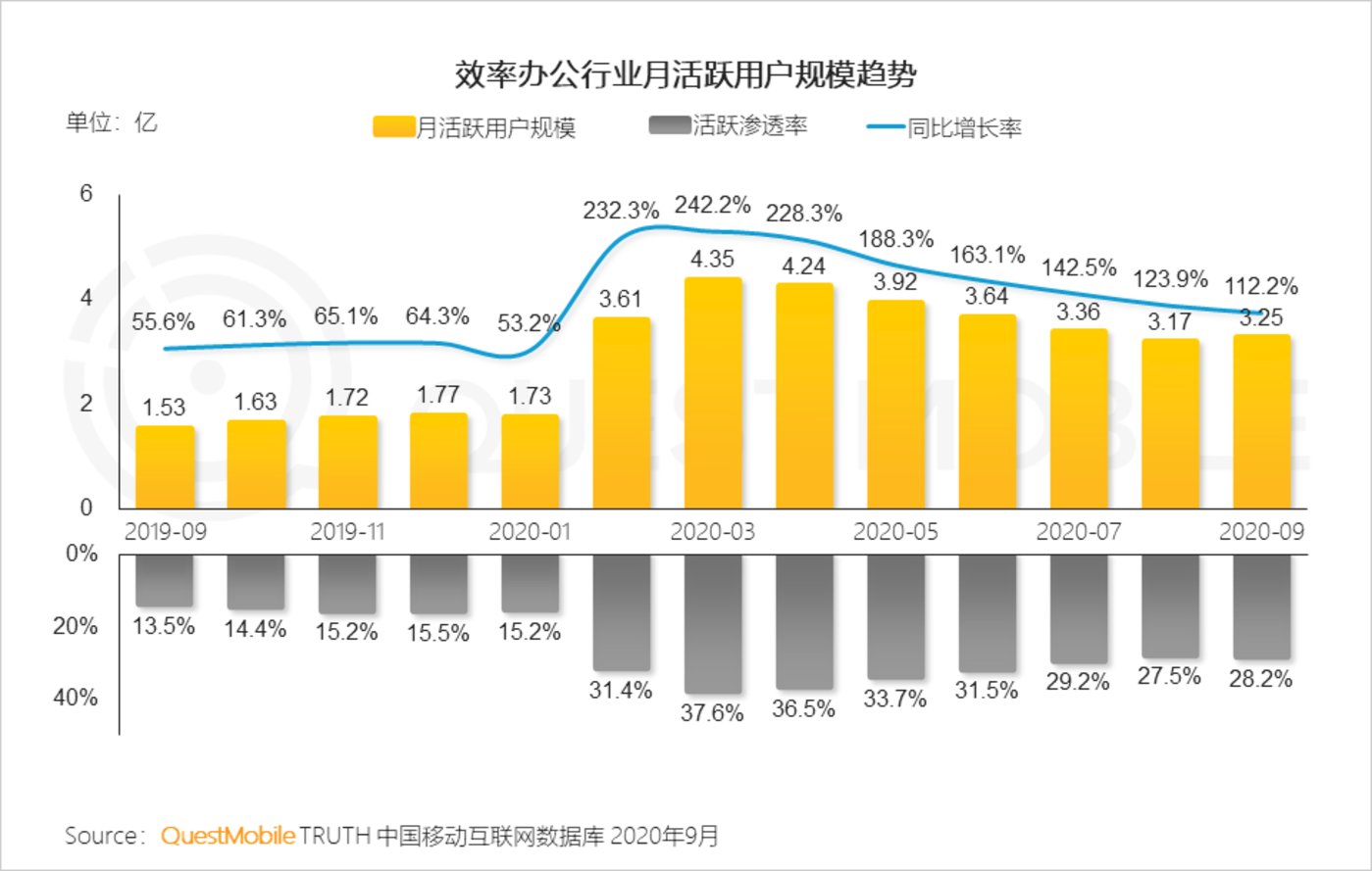 疫情加速催熟远程办公,用户规模与高峰期相比虽有回落,但仍保持在3亿水平,相较去年同期已有超过200%的提升,用户使用习惯逐步养成