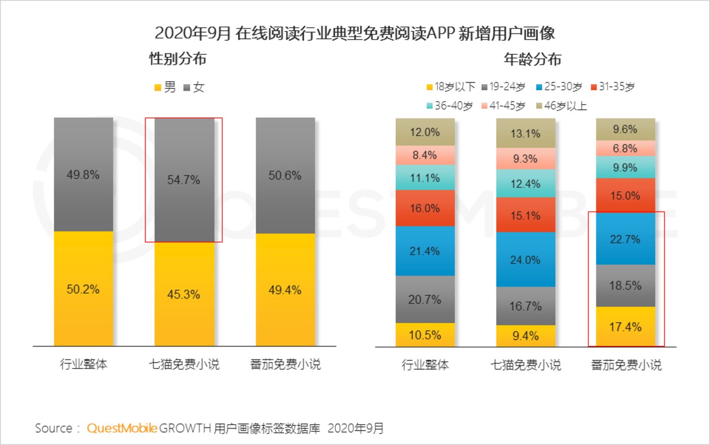 7.2 在线阅读行业新增用户中35岁以下、男性用户居多;番茄免费小说新增用户中30岁以下占比较为突出,七猫免费小说则受到更多女性青睐