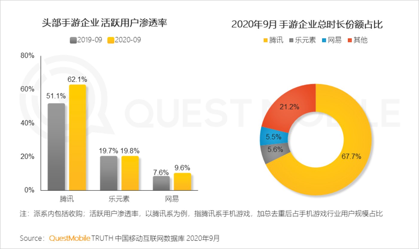 手机游戏行业趋于向头部集中,腾讯、乐元素及网易渗透率均有不同程度提升,三强企业占据手机游戏行业近八成时长