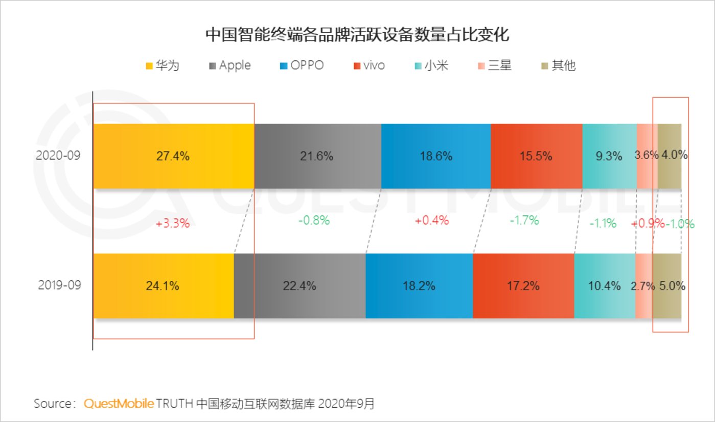 华为活跃设备数量占比持续扩大,vivo、小米、苹果均有不同程度下滑,三星有所回升,小众终端品牌份额进一步被挤压