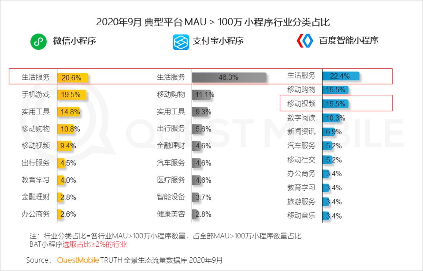 平台特点的差异化在行业分布上得以体现:微信小程序中手机游戏更为突出;支付宝的支付消费场景叠加,为大量服务型小程序提供了流量入口;百度的搜索、信息流优势为众多视频内容型小程序提供精准推荐支持。