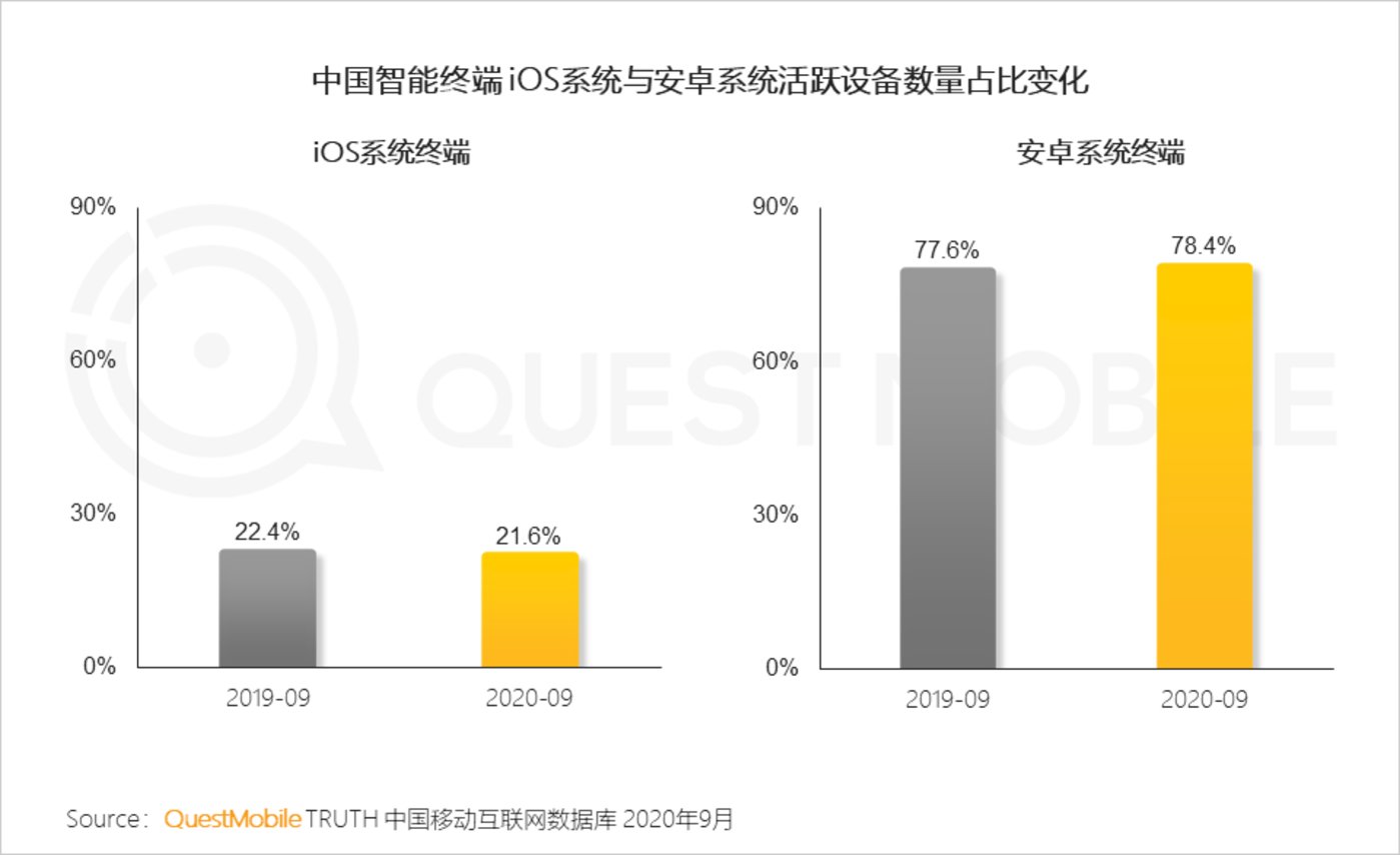 在华为等国产终端品牌带动下,中国智能终端安卓系统份额进一步扩大,iOS系统份额与去年同期相比略有下滑