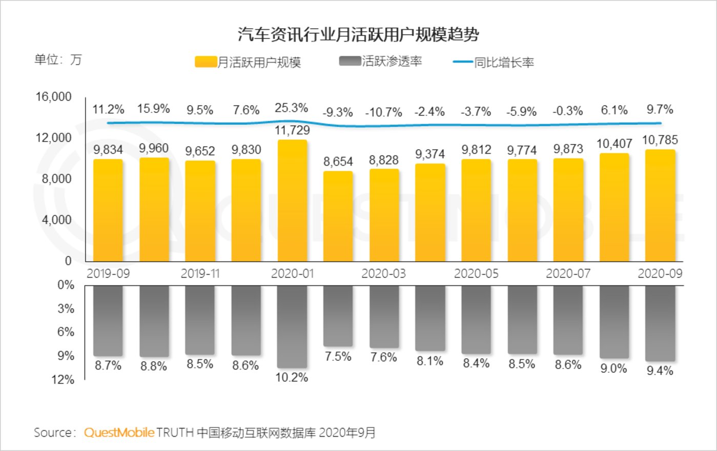 受疫情影响,线下大型车展陆续取消,线上云车展等新形势助力汽车资讯行业活跃用户规模提升,2020年Q3实现同比正增长